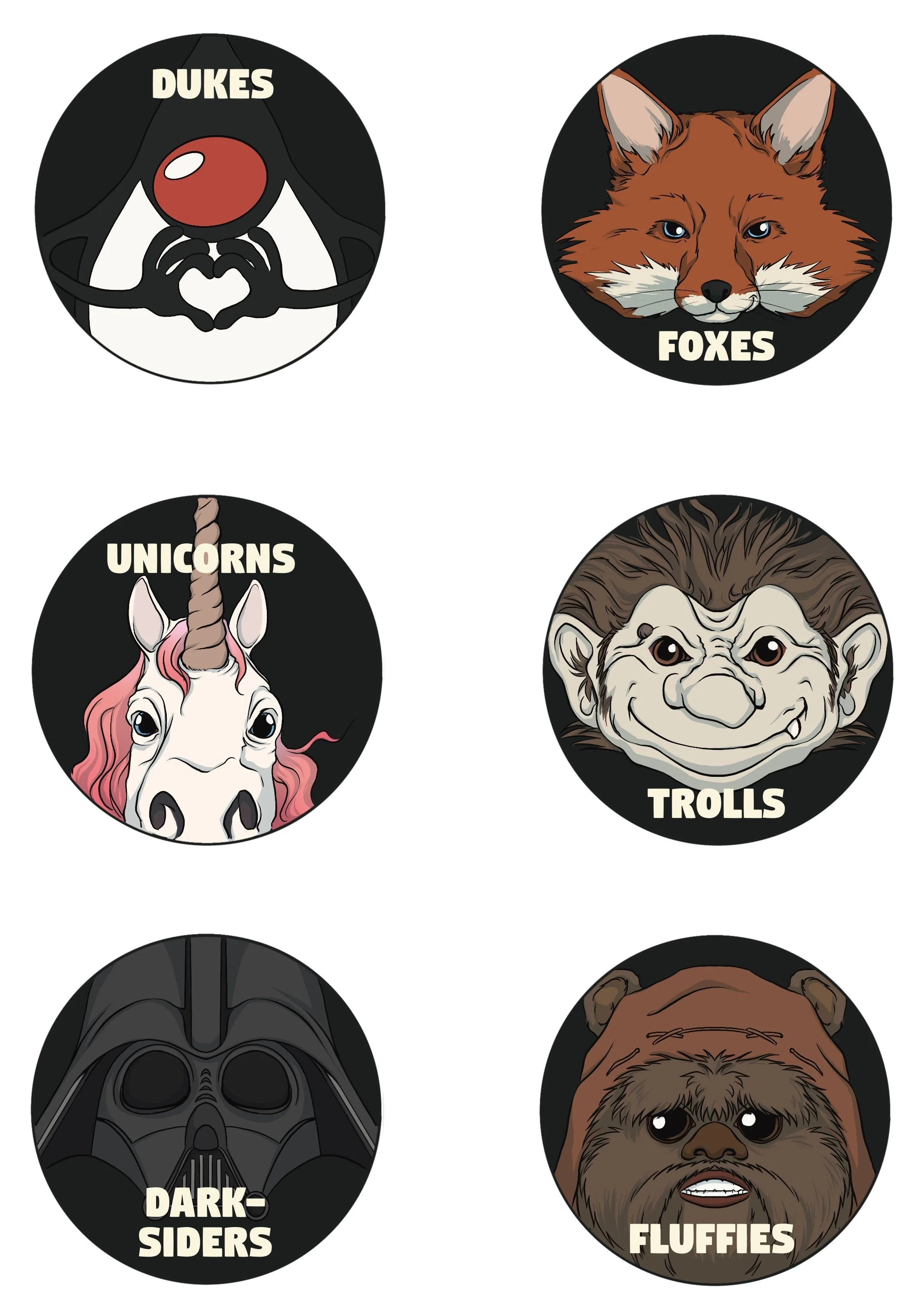 A “Schnitzeljagd” is simply the German term for a scavenger hunt. When I was approached to draw a set of team stickers for an IT-themed Schnitzeljagd my first step was to name the themes. After some consultation with people who work in IT the selection landed on “Dukes" for the Java mascot, “Foxes” for both Firefox and Gitlab (although technically Gitlab's logo is a Tanuki), “Unicorns” for the dream of every IT startup to become a unicorn company, “Trolls” for Internet trolls, and “Darksiders” and “Fluffies” as a nod to Star Wars (without using trademarked names). These stickers were printed and distributed to the participants on the day of the event.
