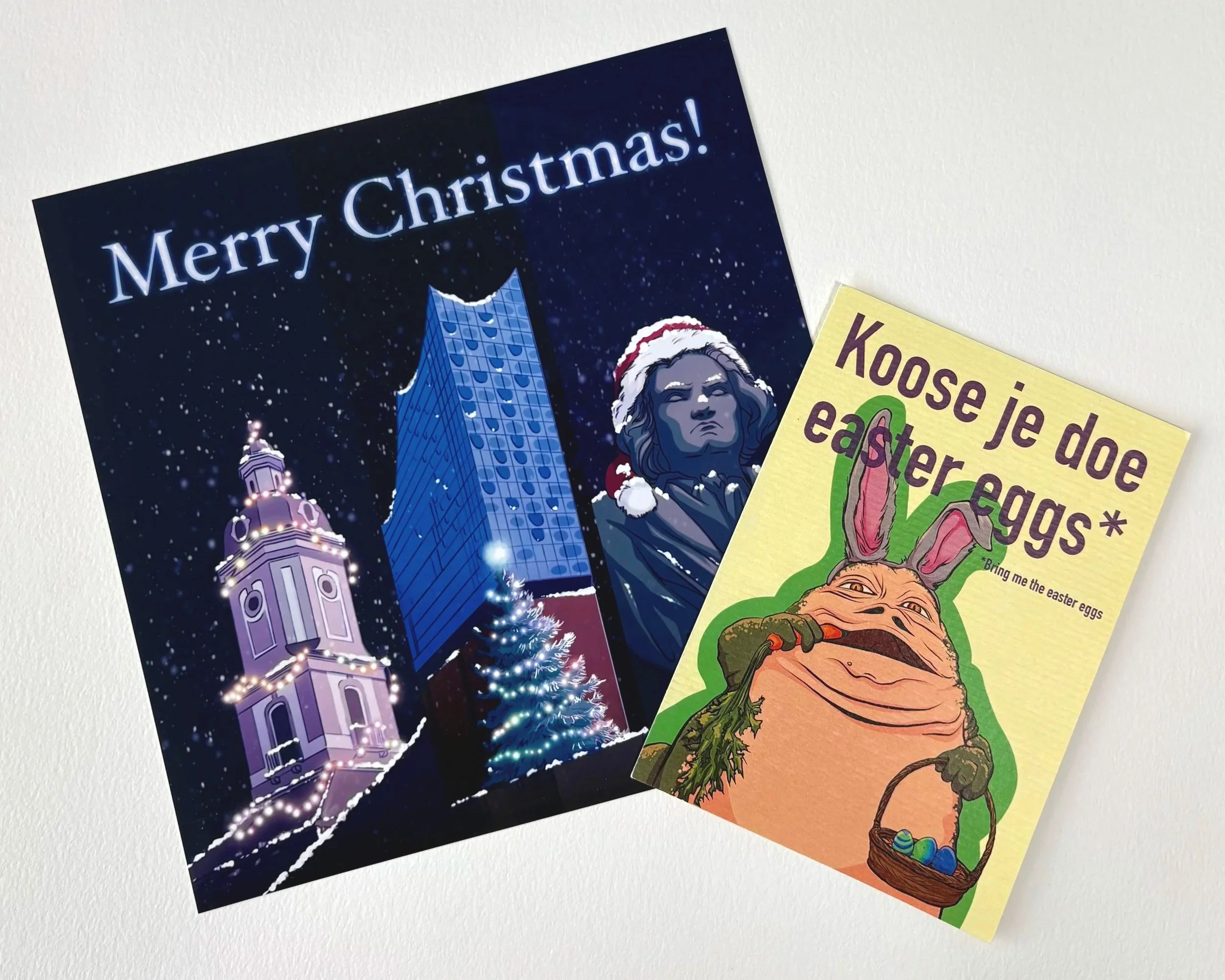Creating festive greeting cards is a bi-yearly task, which means it’s always a challenge to create something recognisable yet fresh. My aim is always to blend established symbolism with unexpected twists.